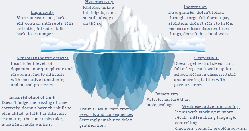 There are clear behaviours that we see from children with ADHD but, the disorder is much more complex than just 'surface' issues. There are many less overt, but no less problematic, issues that accompany ADHD.
